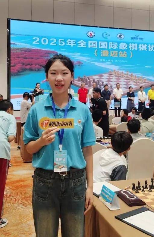 暑假期间,在海南广播电视总台担任实习主持人的浙江传媒学院大学生陈泓霏,现场主持节目,精心摄影,积极宣传报道2025年全国国际象棋棋协大师赛。